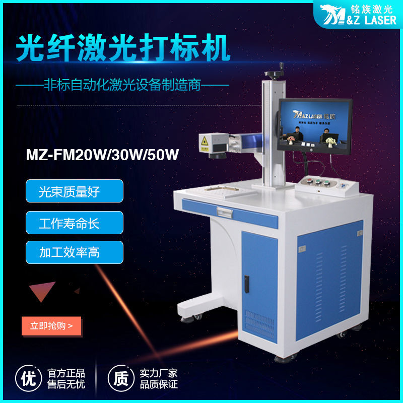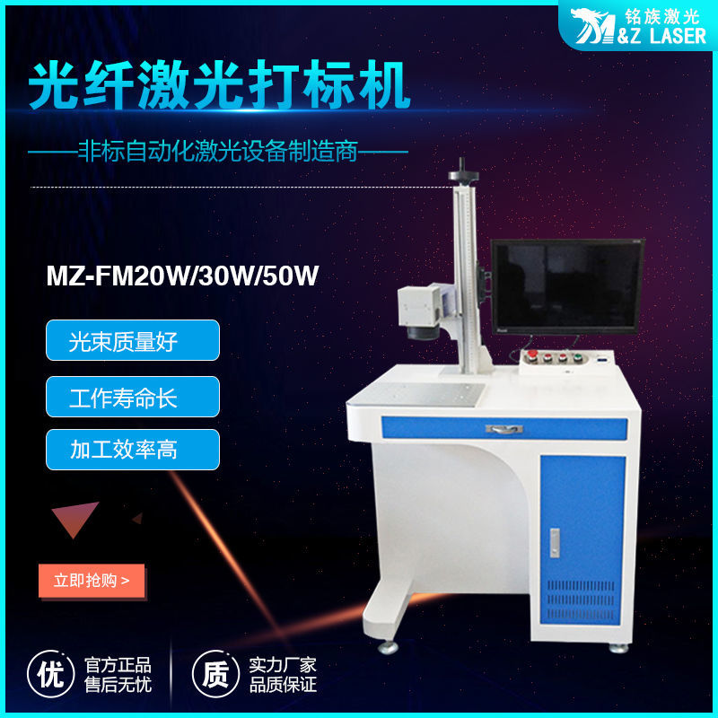 MZ-FM-20/30/50/100W-R光纖激光打標機是我公司運用現今世界上先進的激光技術研制而成的新一代激光打標機系統。采用武漢銳光纖輸出激光,再經高速掃描振鏡系統實現打標功能。光纖激光打標機電光轉換效率高,達到30%以上,采用風冷方式冷卻,整機體積小巧,輸出光束質量好,可靠性高。可雕刻金屬材料和部分非金屬材料,主要應用于對深度、光滑度、精細度要求較高的領域,如鐘表、首飾、模具行業,位圖打標等。